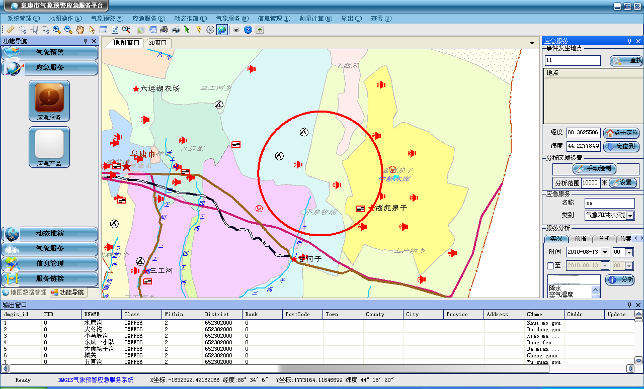 应急服务对应急事件完成精确定位,基于灾害分析模型,完成影响区及地理要素分析、气象条件分析、灾情分析、辅助决策。